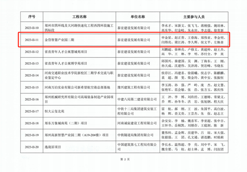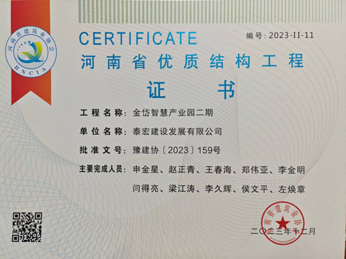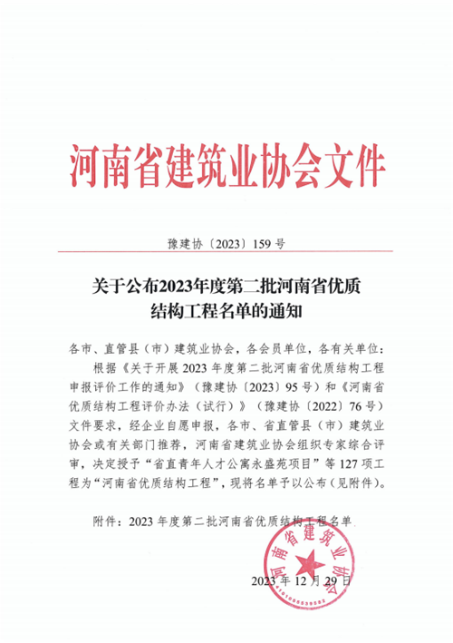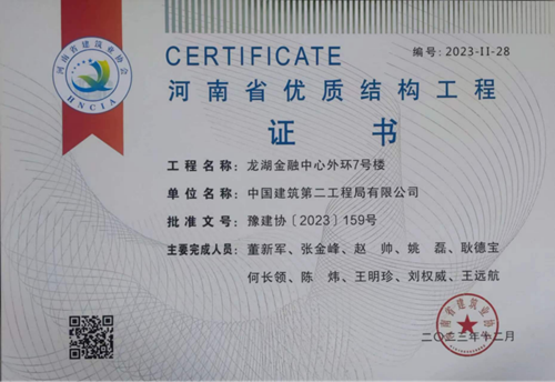 近日,河南省建筑業(yè)協(xié)會發(fā)布《關于公布2023年度第二批河南省優(yōu)質(zhì)結構工程名單的通知》(豫建協(xié)〔2023〕159號),城發(fā)·金岱智慧產(chǎn)業(yè)園二期和龍湖金融中心外環(huán)7號樓兩項工程順利通過專家組考評,榮獲“2023年度河南省優(yōu)質(zhì)結構工程”獎。