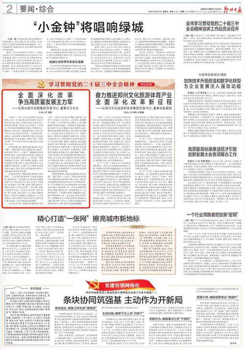 “黨的二十屆三中全會(huì)把深化國(guó)企改革納入進(jìn)一步全面深化改革戰(zhàn)略、推進(jìn)中國(guó)式現(xiàn)代化全局,為國(guó)有企業(yè)在新征程上改革轉(zhuǎn)型指明了前進(jìn)方向,明確了工作重點(diǎn)。”鄭州城市發(fā)展集團(tuán)有限公司黨委書(shū)記、董事長(zhǎng)萬(wàn)永生表示,城發(fā)集團(tuán)將以習(xí)近平總書(shū)記關(guān)于全面深化改革的一系列新思想、新觀點(diǎn)、新論斷和全會(huì)精神為指導(dǎo),通過(guò)戰(zhàn)略性重組和專業(yè)化整合,苦練“內(nèi)功”,筑強(qiáng)“筋骨”,爭(zhēng)當(dāng)中國(guó)式現(xiàn)代化建設(shè)鄭州實(shí)踐的主力軍。