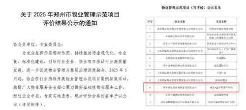 近日,鄭州市物業(yè)管理協(xié)會官網(wǎng)發(fā)布《關(guān)于2025年鄭州市物業(yè)管理示范項(xiàng)目評價(jià)結(jié)果公示的通知》,城發(fā)·金岱智慧產(chǎn)業(yè)園獲評“鄭州市物業(yè)管理示范項(xiàng)目”。