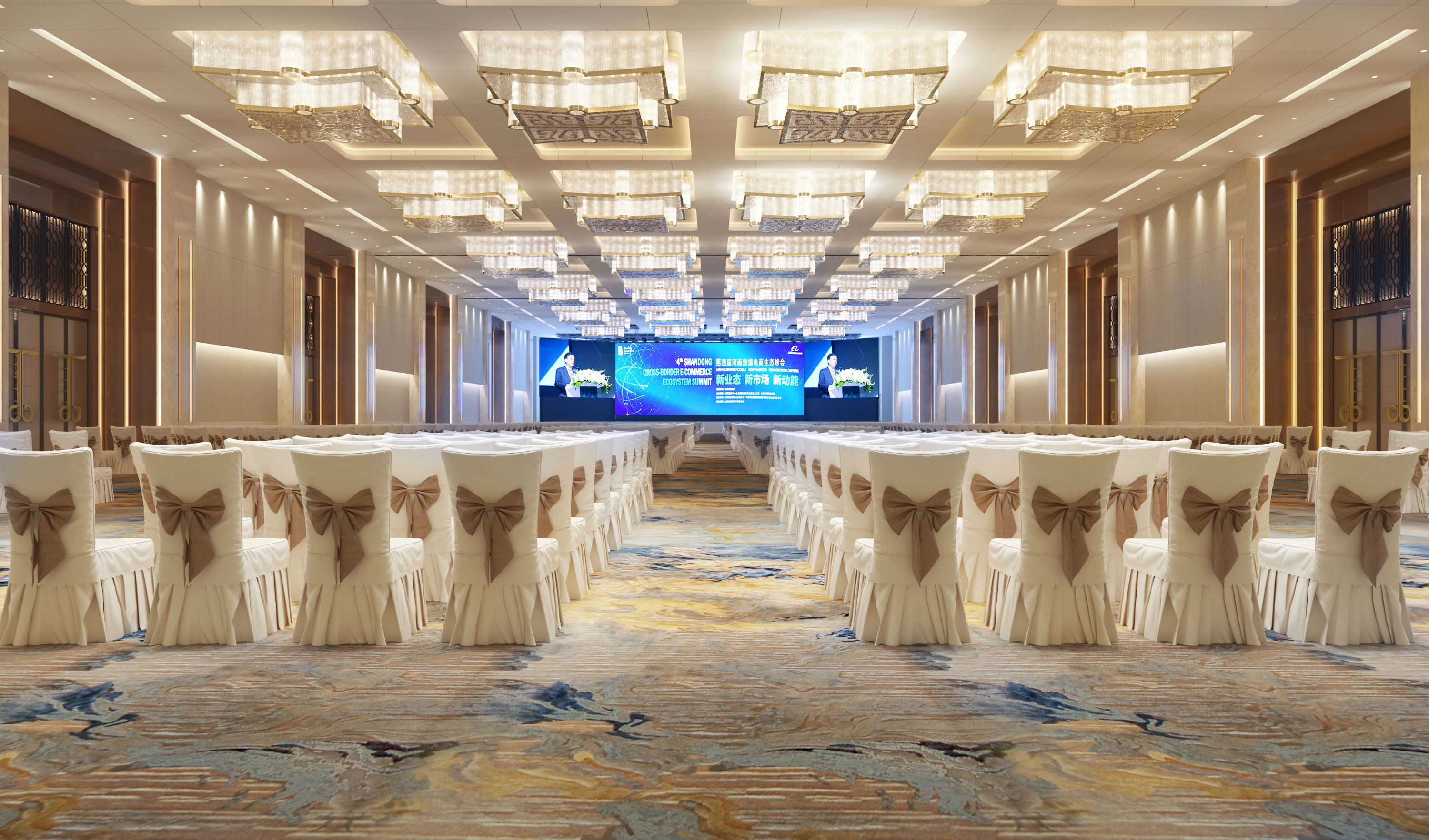奧體中心展覽廳位于鄭州市奧林匹克體育中心游泳館下方,緊鄰鄭州“四個(gè)中心”中央大街,總建筑面積約8500平方米,包含3000平方米展覽廳、大堂前廳、設(shè)備房等配套設(shè)施工程。項(xiàng)目整體設(shè)計(jì)理念取“黃河天水”及“商合”之意,采用了大量的“黃河”及“商都”兩大彰顯地域特色的設(shè)計(jì)元素,表現(xiàn)出韻味十足的鄭州商都文化特色,同時(shí)又兼具現(xiàn)代會(huì)展會(huì)務(wù)的簡約風(fēng)格。
