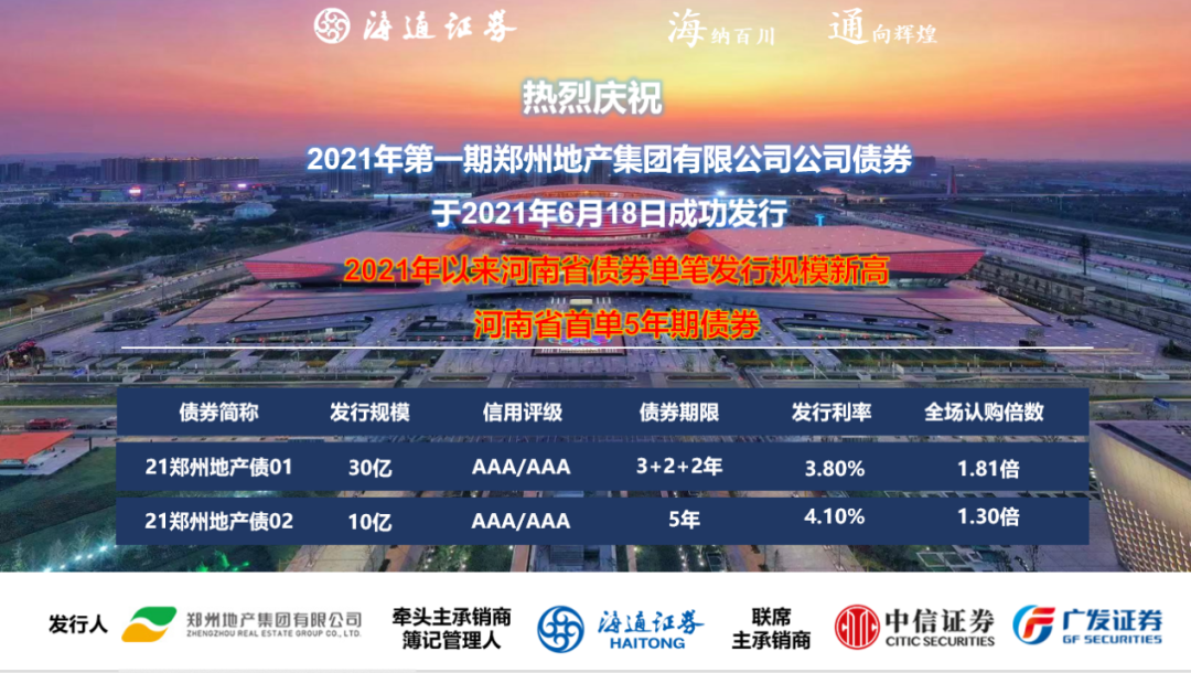黨史學習教育在鄭州地產(chǎn)集團如火如荼開展,集團黨委在鄭州市委、市政府的領(lǐng)導下,在鄭州市國資委黨委的監(jiān)管下,在學黨史、悟初心的基礎(chǔ)上,將“辦實事、解難題”作為黨史學習教育的重要內(nèi)容,充分釋放黨建紅色生產(chǎn)力,推進黨史教育深入業(yè)務實踐,引領(lǐng)業(yè)務高質(zhì)量發(fā)展。在集團黨委的堅強領(lǐng)導下,鄭州地產(chǎn)集團6月18日成功發(fā)行第一期優(yōu)質(zhì)企業(yè)債券40億元,3+2+2年期產(chǎn)品發(fā)行利率3.8%,5年期產(chǎn)品發(fā)行利率4.1%。本次發(fā)行創(chuàng)河南省首單5年期企業(yè)債券,創(chuàng)2021年以來河南省債券單筆發(fā)行規(guī)模新高,是鄭州地產(chǎn)集團資本市場融資工具的又一創(chuàng)新探索!